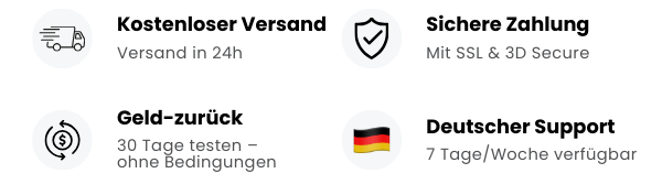 Jede Bestellung wird innerhalb von 24 Stunden vorbereitet und verschickt. Die Lieferzeit beträgt durchschnittlich 3–5 Werktage. Die Sendungsverfolgung wird Ihnen per E-Mail zugesandt.